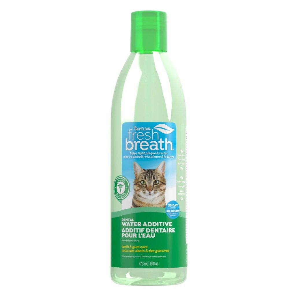 Dental solution additives help keep cats‘ teeth clean. They are added to water or food to reduce plaque buildup.